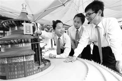 5月7日,北京外事学校的学生交流技能,介绍北京旅游景点。当日,第八届“外事杯”技能大赛专业展示汇报在北京外事学校举行,吸引了多家用人单位前来观摩。近年来,我国职业化教育发展迅猛,据悉,中职生就业率超过95%,高于目前大学毕业生的就业率。 本报记者 赵 晶摄