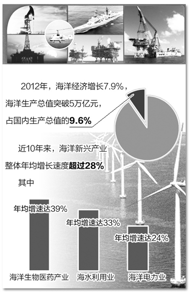 “十一五”时期,我国海洋经济年均增长13.5%。2012年,在宏观经济形势并不乐观的情况下,海洋经济增长7.9%,略高于7.8%的GDP增速,海洋生产总值突破5万亿元,占国内生产总值的9.6%。国家海洋局海洋发展战略研究所研究员刘容子认为,今后,海洋经济仍将保持高于或略高于GDP增速的发展速度。