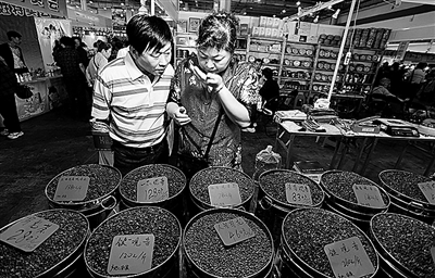 5月8日,观众在“津洽会”日用品展销馆选购茶叶。当日,中国·天津第二十届投资贸易洽谈会的日用品展销馆在天津国展中心拉开帷幕。 王青岩摄(新华社发)