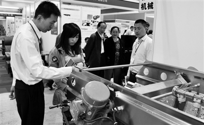 5月9日,一位厂商代表为观众讲解现代化厨房机械知识。当日,第八届中国国际餐饮食品博览会在北京开幕,有超过200家餐饮、食品、机械等厂商参会。 新华社记者 李 欣摄