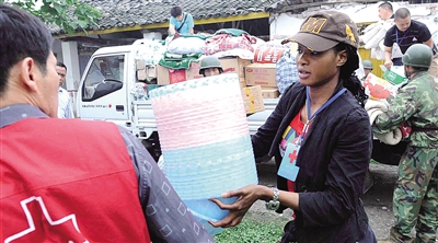红十字国际委员会经济安全代表杜杉(右)在绵竹市孝德镇年画村挑选年画。 新华社发