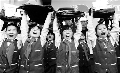 5月15日,小学生代表展示获赠的书包和课外辅导书。当日,由共青团中国青年人才培训中心发起的农民工子女教育公益服务计划在京启动。该计划以农民工家庭为服务对象,包括开办“务工人员家庭教育”培训班、面向外来务工人员开通“咨询服务热线”、组织打工子弟学校学生观看励志电影等服务。 本报记者 赵 晶摄