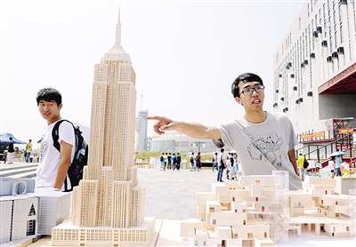 5月22日,几名学生在观赏展出的美国纽约帝国大厦的建筑模型。当日,安徽合肥工业大学建筑与艺术学院举办“建筑风”艺术节活动,学生们把亲手制作的各地知名建筑物的模型和独创的建筑模型作品摆放在校园里,供师生们欣赏。 新华社记者 刘军喜摄