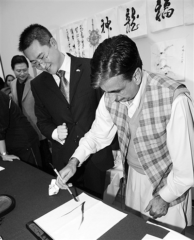 在巴基斯坦首都伊斯兰堡举行的中国文化周上,一名巴基斯坦男子学写毛笔字。 新华社发