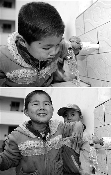 右图 宁夏固原市西吉县硝河乡中小学学生在喝自来水(5月15日摄)。