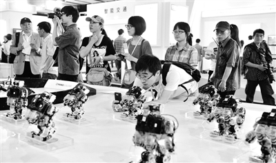 5月22日,观众在北京科博会的展区内观看机器人演示。