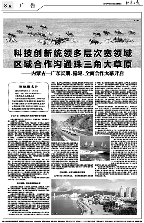 以广东省为核心的珠三角地区,一直以来都是我国对外开放的窗口与桥梁,综合经济实力连续多年居全国前列,生产总值、工业增加值、财政收入、全社会固定资产投资额、货运量、科技发明专利授权量等重要经济指标均居全国领先。特别是改革开放以来,广东省大力发展开放型经济,不断提高自主创新能力,努力构建现代产业体系,形成了全方位、多层次、宽领域的对外开放新格局,广东省在国际产业转移、传统产业转型升级、科技创新、金融投资、高端技术人才聚集等方面取得了巨大成就。内蒙古丰富的自然资源优势、良好的后发优势以及优越的政策条件,与广东发达的产业基础、良好的市场环境、较强的创新能力,刚好形成优势互补,具有广阔的合作发展空间和前景。同时,内蒙古在新能源、新材料、现代农业、生物医药和节能减排等领域的技术需求,与广东近年来大力发展战略性新兴产业所储备的技术成果更是不谋而合,两地可以高效地进行合作开发或成果转化。