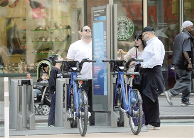 当天,纽约市正式启动“自行车共享计划”,市政府在市区设立330个站点,提供6000辆自行车,供市民和游客使用。这是全美国规模最大的一项自行车共享计划。目前,已有上万人注册成为创始会员。会员只需支付95美元年费就可以无限制租用自行车,非会员可以购买10美元一张的日卡,或25美元一张的周卡。用户可在任一个站点付钱取车或还车,单次用车时间不超过30分钟或45分钟。 (新华社发)