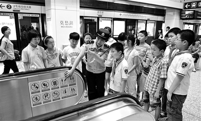 江苏南京地铁公安民警向小学生讲解搭乘地铁的安全小常识。 江 京摄