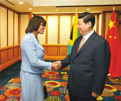 在会见辛普森-米勒时,习近平表示,牙买加是加勒比地区大国,也是中国在本地区最重要合作伙伴之一。双方可以加强基础设施建设、农业、通信、矿产等领域合作。4年前我访问牙买加时,深切感受到牙买加人民对中国文化的喜爱。中国人民对牙买加优秀田径运动员也很熟悉。双方可以加强文化、教育、体育、旅游等方面交流合作。