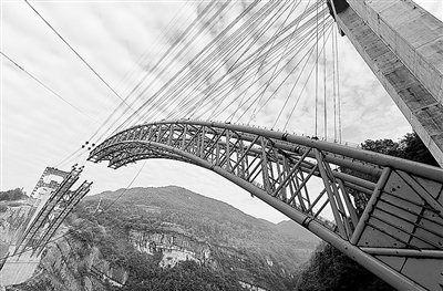 位于湖北省恩施土家族苗族自治州宣恩县境内的恩黔高速公路龙桥特大桥钢管拱架即将合龙。湖北省恩黔(湖北恩施至重庆黔江)高速公路龙桥特大桥为主跨268米的上承式钢管拱桥,建设工期33个月,预计2014年建成通车。 宋 文摄(新华社发)