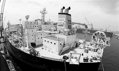 河北山海关船舶重工有限责任公司近日顺利完成存储容量为34万立方米的大型浮式储油卸油船(FSO)的改造工作。该储油卸油船前身是1993年建造的载重30万吨的巨型油轮“北方之珠”,改造前总长334米,改造后总长为387米,存储容量为34万立方米,是集油气储存、外输、装卸、动力供应于一体的高科技海洋平台。图为停靠在码头的大型浮式储油卸油船。 王寒植摄 (新华社发)