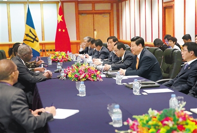 6月2日,国家主席习近平在特立尼达和多巴哥首都西班牙港会见巴巴多斯总理斯图尔特。 新华社记者 兰红光摄