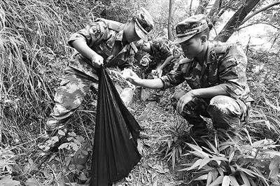 6月5日世界环境保护日当天,广东边防七支队数百名官兵顶着酷暑和蚊虫叮咬,深入深圳市第一“绿肺”梅林山清理垃圾。 廖 键摄