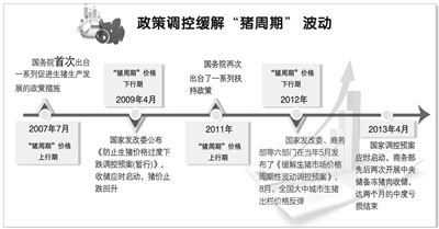 随着存栏量改变,市场行情也在变化,2009年4月底至6月中旬,猪粮比连续7周低于6∶1的盈亏平衡点,“猪周期”迎来价格下行期。当年,国家发改委公布《防止生猪价格过度下跌调控预案(暂行)》,明确了分情况启动加强监测、信息预警、增加储备、适当补贴等几种市场调控措施。面对价格跌势,收储应时启动,猪价止跌回升。