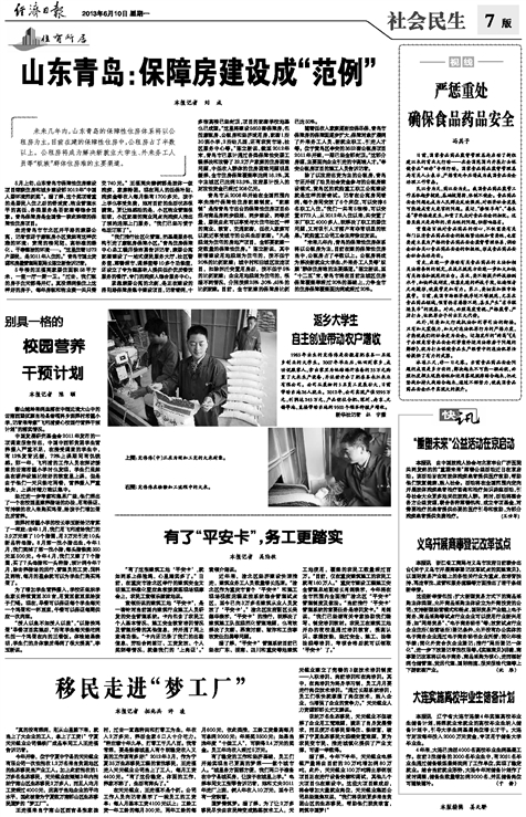 青岛市从2008年开始在全国范围内率先推行保障性住房配建制度。“配建制”是指青岛市出台的保障性住房项目必须与商品房同步规划、同步建设、同等质量,居民由此可以享受与大住宅社区一样的商业、教育、交通配套,低收入家庭可以就近享受城市的公共生活配套。“凡是规划为住宅的房地产项目,全部要配建一定数量的保障性住房。”陈立新说,其中新增建设用地规划为住宅的,按不低于20%的比例配建;城中村和旧城区改造项目,扣除拆迁安置用房后,按不低于5%的比例配建;企业用地规划为住宅的,根据不同情况,分别按照25% 、30% 、45% 的比例配建。目前,全市配建的保障房比例已达50%。