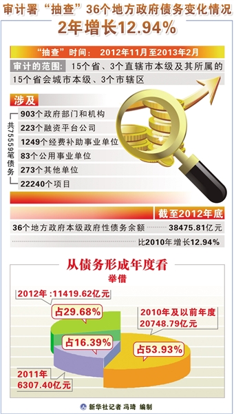 6月10日,审计署公布了36个地方政府本级2011年以来政府性债务情况。本次审计的范围包括15个省、3个直辖市本级及其所属的15个省会城市本级、3个市辖区,涉及903个政府部门和机构、223个融资平台公司。审计结果显示,2011年以来,上述地方政府债务余额增长了12.94%,总量达到38475.81亿元。各地在加强新增债务管理、清理规范融资平台公司工作取得进展的同时,融资平台公司退出管理不到位、偿债能力不强的问题仍然突出。