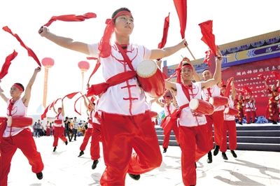 6月10日,北京延庆县举办第五届北京端午文化节百姓欢乐季,当地的农民腰鼓队表演了喜庆节目。
