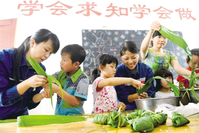 端午节前,陕西咸阳供电局张思德电力服务队员工来到咸阳市特殊教育学校,和孩子们一起包粽子、做游戏。 本报记者 赵 晶摄