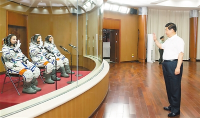 航天员出征仪式在酒泉卫星发射中心航天员公寓问天阁举行。14时28分,习近平来到这里,亲切看望执行这次飞行任务的航天员聂海胜、张晓光、王亚平。习近平对航天员们说,看到你们精神饱满、英姿勃勃,我感到很高兴。在你们即将出征之际,我代表党中央、国务院、中央军委,代表全国各族人民,来为你们壮行。你们执行我国第五次载人航天飞行任务,承载着中华民族的航天梦,展现了中国人“敢上九天揽月”的豪情壮志,这是光荣而又神圣的,全国人民都为你们感到骄傲。为了这次飞行任务,你们进行了认真扎实的训练,各方面做了精心周密的准备,我对你们圆满完成任务充满信心。预祝你们成功,期待你们凯旋。
