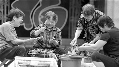 图 6月11日,河北易县七峪乡武家庄村方秀芬(左二)一家在包粽子。 本报记者 李景录摄