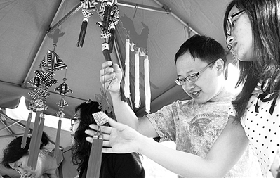 图 6月11日,北京陶然亭公园,游客在挑选手工“缯子”。端午节期间,陶然亭公园组织了多项文化活动,展示与端午有关的民俗文化。
