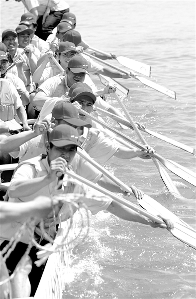 6月11日,北京延庆县夏都公园,龙舟队你追我赶,与游客共度端午节。