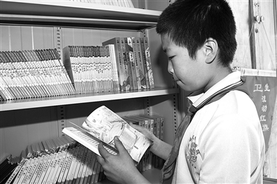 6月13日,在北京市海淀区民办打工子弟学校振兴小学,一名学生在“爱心书架”旁阅读自己喜爱的《昆虫记》。