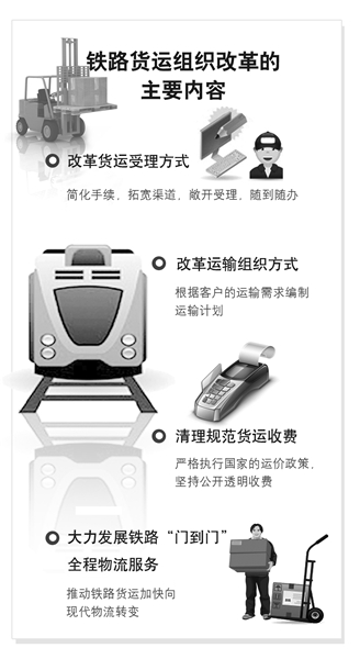 据中国铁路总公司运输局负责人介绍,这次铁路货运组织改革的主要内容包括:一是改革货运受理方式。简化手续,拓宽渠道,敞开受理,随到随办,给广大客户提供最直接、最方便、最快捷的服务。二是改革运输组织方式。根据客户的运输需求编制运输计划,及时安排装运,提高运输效率。三是清理规范货运收费。严格执行国家的运价政策,坚持依法合规、公开透明收费。四是大力发展铁路“门到门”全程物流服务。构建“门到门”接取送达网络,实行“门到门”全程“一口价”收费,推动铁路货运加快向现代物流转变。