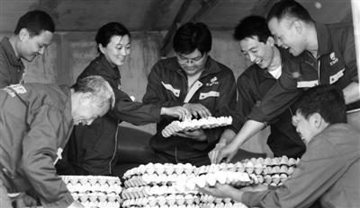 图① 赵亮、张蕊、崔洋、刘洋、佟震(后排从左至右)和村民一起在养殖场分拣鸡蛋。