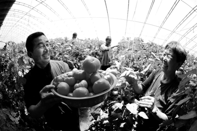图④ 村民陈则江(左一)、王秀珍正在采摘西红柿,在村官的技术指导下,他们的大棚蔬菜收益颇丰。