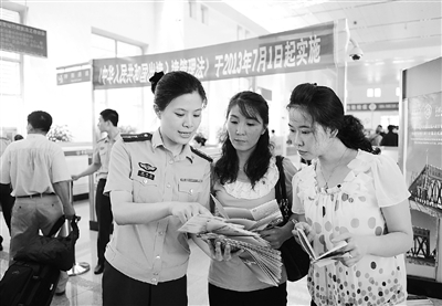 6月20日,丹东边防检查站警官常雁宸(前左)向出境旅客宣传新法规。新的《中华人民共和国出境入境管理法》将于7月1日起实施,为切实增强口岸从业人员和服务对象对新法的认识,努力营造安全和谐口岸环境,近日,丹东边防检查站官兵深入口岸一线开展“知法、懂法、守法”为主题的宣传活动。