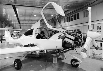 6月21日,山东滨奥飞机制造有限公司工作人员在航电车间装配钻石系列轻型飞机。