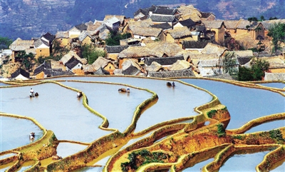 图为哈尼族群众在梯田中劳作的场景。新华社发