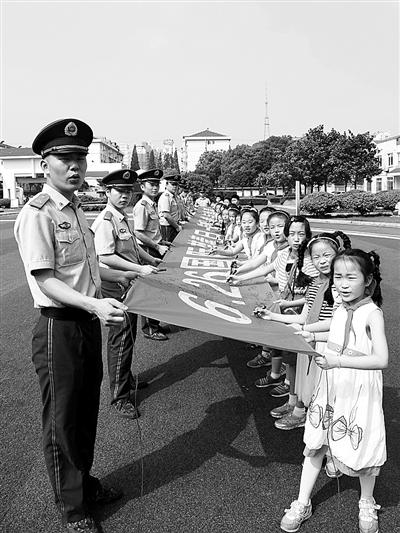 6月21日,江苏公安边防总队海警支队的官兵走进驻地小学开展禁毒宣传教育活动。图为官兵们和小学生一起在印有“抵制毒品,参与禁毒”的横幅上签字,誓言远离毒品。 苏红锋摄