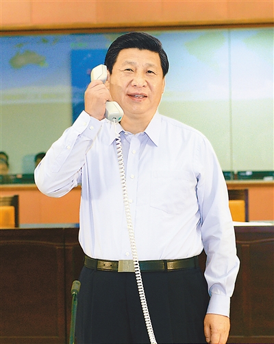 8时38分,天宫一号与神舟十号组合体正运行在祖国上空。习近平走到飞控大厅指挥席前,拿起话筒同航天员通话。总书记面带微笑,注视着飞控大厅巨型电子屏幕。屏幕上清晰地显示着天宫一号内的实时画面。3名航天员站成一列,精神饱满,神情自然。