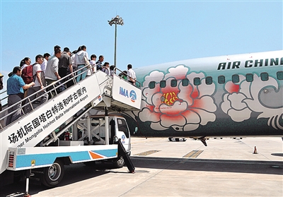 6月25日,前往台北的旅客在呼和浩特白塔国际机场登机。当日,中国国际航空公司开通呼和浩特至台北直飞航线,这条航线的班期为每周3班,每班提供8个公务舱和156个经济舱座位。 新华社记者 于 嘉摄