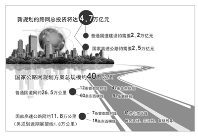 国家发展改革委会同交通运输部编制的《国家公路网规划(2013年-2030年)》(以下简称《规划》)日前获得国务院批准。根据规划,全国所有县级及以上行政区将都有普通国道覆盖,国家高速公路连接所有地级行政中心及城镇人口超过20万的中等及以上城市。新规划的路网总投资将达到4.7万亿元人民币。巨额资金从何而来如何分配?新的路网规划因何制定?大规模的公路路网建设又会对经济社会发展起到怎样的促进作用?
