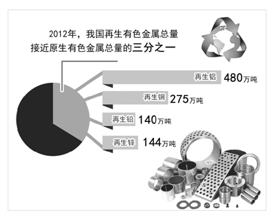 2012年,中国再生铝生产480万吨,再生铜生产275万吨,再生铅生产140万吨,再生锌生产144万吨。四大品种生产总量1039万吨,同比增长3.7%,再生有色金属总量已经接近原生有色金属总量的三分之一。同时,再生有色金属回收数量在逐年提高。2012年,国内四大品种废料回收总量660多万吨(金属量),同比增长5.09%。其中,铜废料回收130万吨、铝废料回收270万吨、铅废料回收140万吨、锌废料回收150万吨。
