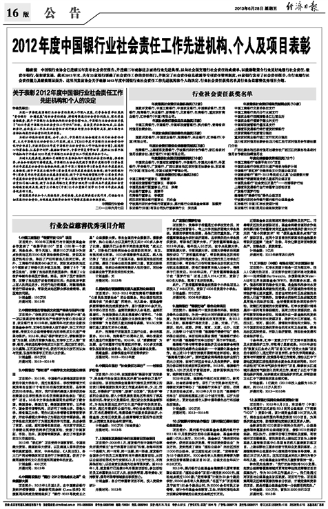 2012年度中国银行业社会责任工作先进机构、个人及项目表彰