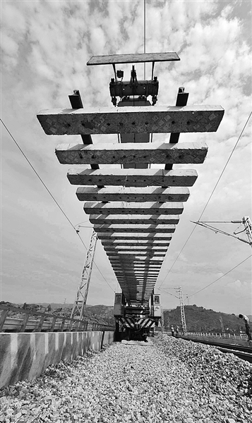 中铁二十三局铺轨机在重庆市长寿区龙溪河特大桥上铺轨。6月29日深夜,中铁二十三局的一台铺轨机在重庆市长寿区渝利铁路的72公里处铺下最后一组轨排,标志着渝利铁路正线双线顺利铺通,预计年底达到通车条件。