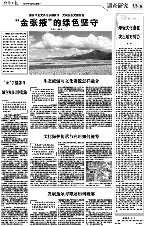 编者按 张掖,位于甘肃河西走廊中部、丝绸之路文化发展带上。近年来,张掖立足生态优势,致力于发展生态经济,在甘肃省率先走出了一条独具特色的绿色发展之路。今年年初,国务院批复甘肃建设华夏文明传承创新区,并确定了围绕“一带”,建设“三区”,打造“十三板块”的工作布局。“一带”便是丝绸之路文化发展带,河西走廊文化生态区则是“三区”之一。作为古丝绸之路重镇,同时也是国家历史文化名城的“金张掖”,在华夏文明传承创新区这个新的舞台上,如何挥袖起舞,依托丰富的生态文化资源,用绿色发展的理念擦亮这块“金”字招牌?本报记者深入张掖市调研。
