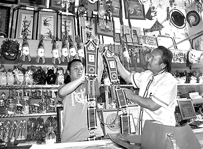 现在,柯璀玲的儿子大学毕业后也参与到民族文化传承事业中,正在读大学的女儿学的是工艺设计专业。“以前做工艺品的量比较少,只是为了传承而传承。”学财务出身的白生龙颇有头脑,2006年,他们开了民族服饰店。“用商业的方式更容易让人接受,是个双赢的途径。”