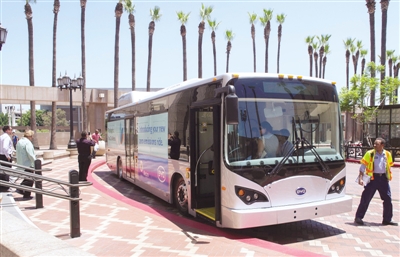 6月27日,一辆比亚迪K9电动大巴停在美国洛杉矶大都会交通管理局门口进行展示。当日,洛杉矶大都会交通管理局和中国比亚迪公司联合宣布,25辆比亚迪电动大巴明年起将加入洛杉矶公交系统,这是洛杉矶县使用的首批电动大巴。这批电动大巴由比亚迪公司设在南加州兰开斯特市的工厂生产,从明年起陆续分批交付。 新华社发
