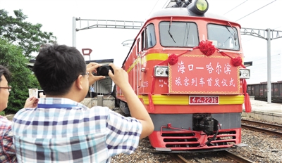 7月2日,在海口火车站,乘客在拍摄火车头。当日,中国最南省会城市海口与最北省会城市哈尔滨之间的首列直通列车——K1122/3次列车从海口发车。直通列车沿途经过11个省份,运行里程为4458公里,运行时间65小时。新华社记者 赵颖全摄
