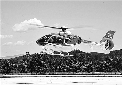 7月2日,首航直所属直升机EC135起飞。当日,第十五届北京国际航空展飞行动态展暨首届北京延庆通用航空旅游文化节预热活动在北京八达岭机场举行。展会将于9月24日在京举行。 陆宇烁摄(新华社发)