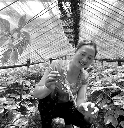 2012年,全县“林下经济”实现产值2.1亿元,帮助农民人均增收4100元,成为当地百姓增收主渠道。图为留坝县留侯镇闸口石村村民吴青花在自家地里展示她家种植