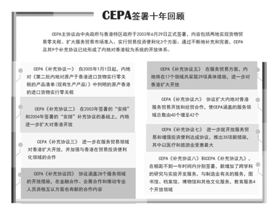 今年7月1日,香港迎来了第十六个回归祖国周年纪念日,同时也是《内地与香港关于建立更紧密经贸关系的安排》(CEPA)颁布的10周年。香港特别行政区行政长官梁振英在出席当日举行的香港特别行政区成立16周年酒会时表示,2003年起,通过CEPA的主体文件和每年的补充协议,内地向香港的工商、金融和专业服务等行业不断开放,内地的市场十分庞大,尽早用好CEPA对香港极为重要。