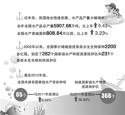 养殖提质首先要有良种。截至2012年底,全国共建有国家级水产原良种场65个,与2011年底相比增长8.33%;沿海一级以上渔港和内陆重点渔港169个,与2011年底相比增长6.96%;创建国家级水产种质资源保护区368个,与2011年底相比增长30.50%。