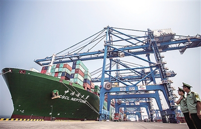 7月6日,大窑湾边检站官兵在大连港准备登上一艘靠港集装箱货轮进行检查。据统计,2013年上半年大连港集团集装箱吞吐量与货物吞吐量大幅增长,共完成货物吞吐量1.69亿吨。 桂子云摄(新华社发)